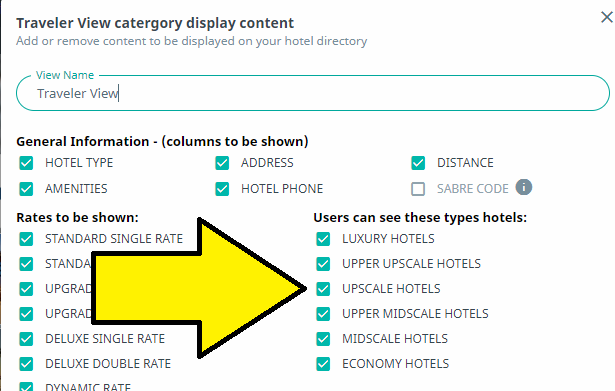 In order to accomplish this, you will need to specify what types of hotels users of a particular hotel directory view can see on their copy of the hotel directory.