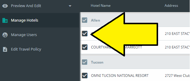 Uncheck the box beside the hotel that you wanted to add. A notification will pop-up once the hotel has been removed.